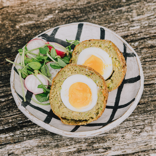 Free range boiled EGG (32%); Mashed potato (MILK); Peas (14%); Vegan Pesto (7%) (Basil, Sunflower oil, Nutritional Yeast, Salt, Garlic, Lactic acid); Broad Beans; Breadcrumbs (*WHEATFLOUR); Rapeseed Oil; Salt; Pepper; Nutmeg; Free Range beaten EGG; Milk (MILK); Butter (MILK); Flour (*WHEATFLOUR). Cooked in Rapeseed oil.