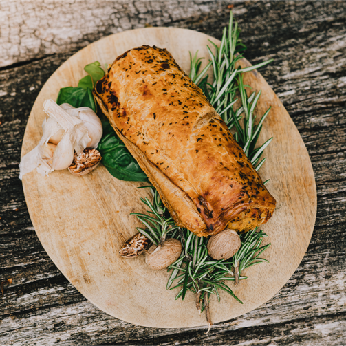 Ingredients: Filling: Sweet Potato (66%); Goats Cheese (13%); Fresh breadcrumbs (*WHEATFLOUR); Salt, Garlic Puree, Pepper, Rosemary, Nutmeg, Free range EGG. Pastry (43.7%): *WHEATFLOUR flour, Butter (from MILK), Water, Sea salt (No anti-caking agent).