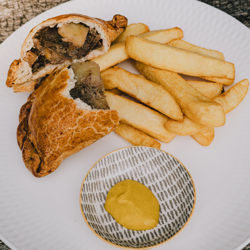 Our Traditional Pasty is made using an authentic Cornish recipe with a British beef skirt, potatoes, swede and onions and a black pepper zing! We make our shortcrust butter pastry which is crimped by hand.
